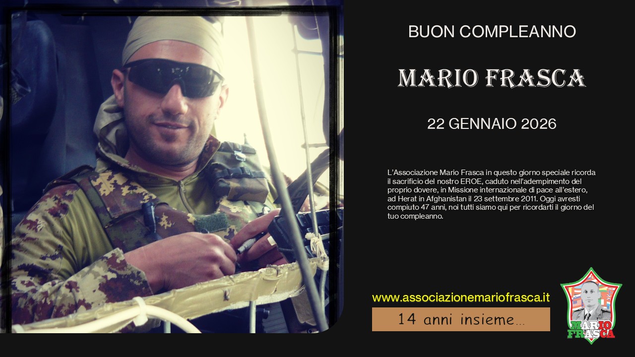 Il 22 Gennaio avrebbe compiuto 47 anni il Caporal Maggiore Capo Mario Frasca (Vittima del dovere) deceduto in Afghanistan durante la Missione Internazionale di Pace all’estero il 23 settembre 2011, ad Herat in Afghanistan per un atto ostile che ha fatto ribaltare il mezzo VTLM Lince.
