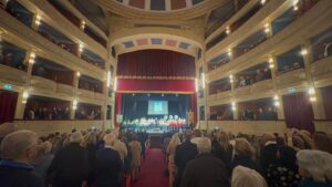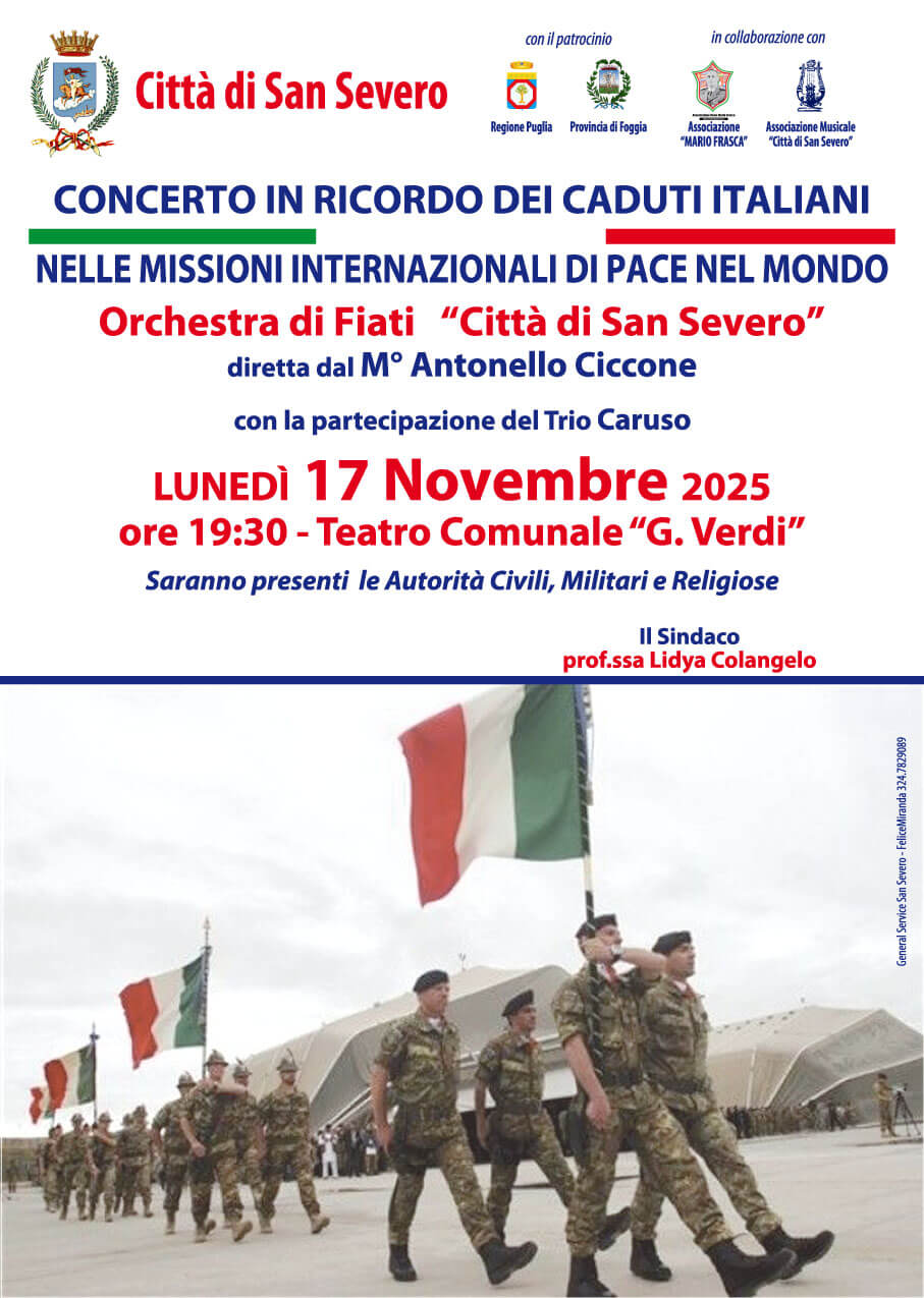 San Severo, 17 novembre 2025 – Si è tenuto al Teatro G. Verdi di San Severo, la decima edizione del Concerto in ricordo dei Caduti italiani nelle Missioni Internazionali di pace all’estero, dal 1950 ad oggi. In apertura di serata il canto degli italiani l’Inno di Mameli suonato dall’orchestra di Fiati Città di San Severo diretta dal M° Antonello Ciccone e cantato dai bambini. Altro momento importante il ricordo da parte dell’Arma dei Carabinieri del Comando di San Severo nel ricordare il carabiniere Sebastiano MARRONE, deceduto pochi giorni fa a causa di un tragico incidente stradale. Il concerto giunto alla sua decima edizione organizzato dal Comune di San Severo, dal M° Antonello Ciccone e dall’Associazione Mario Frasca, ha visto la partecipazione di Autorità civili, militari, religiose, associazione e della comunità cittadina. Durante il corso della serata sono state proiettate le immagini di tutti i Caduti dal 1950 ad oggi: AIELLO Antonino, ANTONUCCI Gerardo, ARINGHIERI Roberto, BACCARO Pasquale, BATTAGLIA Concetto Gaetano, BECI Marco, BETTI Marco, BIONDINI Massimiliano, BRAJ Manuele, BRIGANTI Marco, BRUNO Giovanni, BRUNO Massimiliano, BUCCI Riccardo, BUTTAGLIERI Giuseppe, CALIPARI Nicola, CALLEGARO Marco, CALO’ Carmine, CARDELLA Vincenzo, CARLINO Cosimo, CAROPPO Alessandro, CARRISI Alessandro, CARROZZA Tommaso, CASAGRANDE Davide, CAVAGNERO Giuseppe, CAVALLARO Giovanni, CELLI Sergio, CERZA Carmine, CHIEROTTI Tiziano, CIARDELLI Nicola, CIORBA Adriano, CIRILLO Marco, COLA Simone, COLAZZO Antonio Pietro, COLETTA Giuseppe, CONGIU Cristiano, CUOMO Roberto, CURRO’ Francesco, D’AMICIS Daniele, D’AURIA Lorenzo, DE CILLIS Pier Davide, DE LUCA Onorio, DE MARCO Matteo, DE RISI Giovanni, DE TRIZIO Carlo, DI GIOVANNI Filippo, DI LEGGE Massimo, DI LISIO Alessandro, DI SARRA Marco, DRAGANO Pasquale, FABI Armando, FELE Nicola, FENOGLIETTI Ermanno, FERRARO Emanuele, FICUCIELLO Massimo, FILIPPA Andrea, FIORETTI Giuseppe, FIORITO Manuel, FOCCIA’ Angelo, FONDI Tommaso, FORCUCCI Arnaldo, FORNER Daniel, FORTUNATO Antonio, FOSCI Luciano, FRASCA Mario, FRASSANITO Enrico, FREGOSI Enzo, GALLO Giovanni, GALLONI Marcello Joseph, GARBATI Giulio, GATTI Massimo, GHIONE Daniele, GHITTI Ivan, GIGLI Mauro, GIORGI Dario, GONELLI Giorgio, INTRAVAIA Domenico, LA BANCA Antonio, LA ROSA Giuseppe, LAMPONI Mario, LANGELLA Giorgio, LATTANZIO Franco, LAZZARESCHI Lorenzo, LAZZARO Giuseppe, LI CAUSI Vincenzo, LIGUORI Carlo, LIMA Giuseppe, LUINETTI Maria Cristina, MAJORANA Horacio, MAMONE Antonio, MANCA Gianmarco, MANCINELLI Gionata, MARCACCI Martano, MARCHINI Roberto, MARRACINO Salvatore, MATTA Marco, MERLINO Filippo, MESSINEO Francesco Paolo, MILLEVOI Andrea, MIOTTO Matteo, MONTAGNA Fabio, MONTESI Filippo, MUREDDU Matteo, MUSCELLA Andrea, NARDONE Luigi, NASINI Fabrizio, NATALE Silvano, NIGRO Dino Paolo, NISI Elio, OLIVIERI Carlo, OLLA Silvio, ORLANDO Giuseppe, PADULA Michele, PAGA Francesco, PALADINI Daniele, PAOLICCHI Stefano, PARISI Giuseppe, PARMEGGIANI Amedeo, PASCAZIO Luigi, PEDONE Marco, PETRUCCI Pietro, PETRUCCI Roberto, PEZZULO Giovanni, PIBIRI Alessandro, PISTONAMI Giandomenico, POLSINELLI Luca, PONZIANO Rosario, POSITANO Francesco, POSSENTI Silvestro, QUADRINI Italo, QUADRUMANI Nazzareno, RAGAZZI Alfio, RAMACCI Fiorenzo, RAMADU’ Massimiliano, RANDINO Massimiliano, RANZANI Massimo, REMOTTI F. Paolo, RICCARDO Umberto, RICCHIUTO Davide, RICCI Mauro, RIGHETTI Giorgio, RIGLIACO Marco, ROLLA Stefano, ROMANI Alessandro, RUGGE Stefano, RUZZI Giulio, SAGLIMBENI Giuseppe, SALACONE Flavio, SANFILIPPO Michele, SANNA Luca, SEMPRONI Pio, SGRO’ Antonino, SILVESTRI Michele, SORINO Vitantonio, SORU Raffaele, SPARTA Antonio, STABILE Salvatore, STIGLIANI Nicola, STRAMBELLI Giovanni, TARANTINO Antonio, TOBINI Davide, TRINCONE Alfonso, TUCCILLO Gaetano, UTZERI Samuele, VAIRA Diego, VALENTE Luca, VALENTE Roberto, VANNOZZI Francesco, VANZAN Matteo, VELARDI Giuliano, VENTURINI Enzo, VIANINI Bruno, VILLE Sebastiano, VISIOLI Rossano, VITALIANO Massimo. Insieme al ricordo anche il pensiero ai familiari dei militari e civili caduti nell’adempimento del proprio dovere contro la lotta al terrorismo.